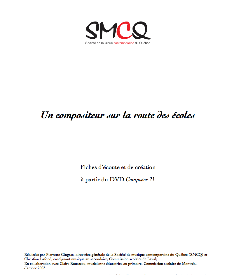 Composer?!, c’est un DVD éducatif et ludique qui présente de façon chaleureuse et décontractée 12 compositeurs canadiens de musiques nouvelles. Chacun se voit consacrer une entrevue, une page de questions/réponses amusantes, une courte présentation et deux extraits musicaux illustrés. L’objectif de ce document est de créer un premier contact avec des compositeurs vivants, par une galerie de portraits où les artistes exposent en termes simples leurs motivations et leur passion pour la musique.Un cahier pédagogique a été développé à l’aide de musiciens éducateurs afin de fournir des pistes concrètes d’utilisation du DVD Composer?! à des fins pédagogiques. Il réunit des fiches d’écoute et de création pour le primaire et le secondaire.